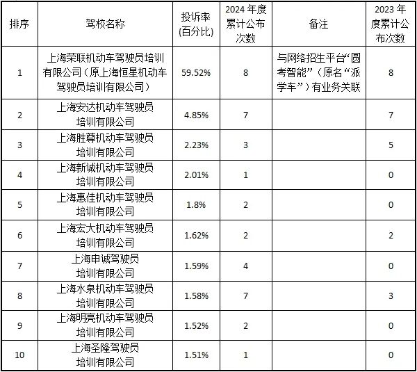 2024年8月投诉率排序 经统计,2024年8月,本市驾培行业投诉件930件,其中退费类诉求809件(占全行业投诉87%),有约三分之一的投诉人无法提供与驾校签订的培训合同作为退费依据。 上海星元机动车驾驶员培训有限公司、上海福龙驾驶员培训有限公司、上海祥翔机动车驾驶员培训有限公司3家驾校(均与网络招生平台“阡陌学车”有业务关联)因存在大量退费纠纷,已暂停招收新学员。 上海巴士电车汽车驾驶员培训有限公司已暂停经营,不再招收新学员。 以下10家驾校2024年8月份投诉率排序靠前。 注:投诉率以市道运中心接到的2024年8月份驾校投诉量(投诉人次)与该驾校核定的培训能力数量之比例。