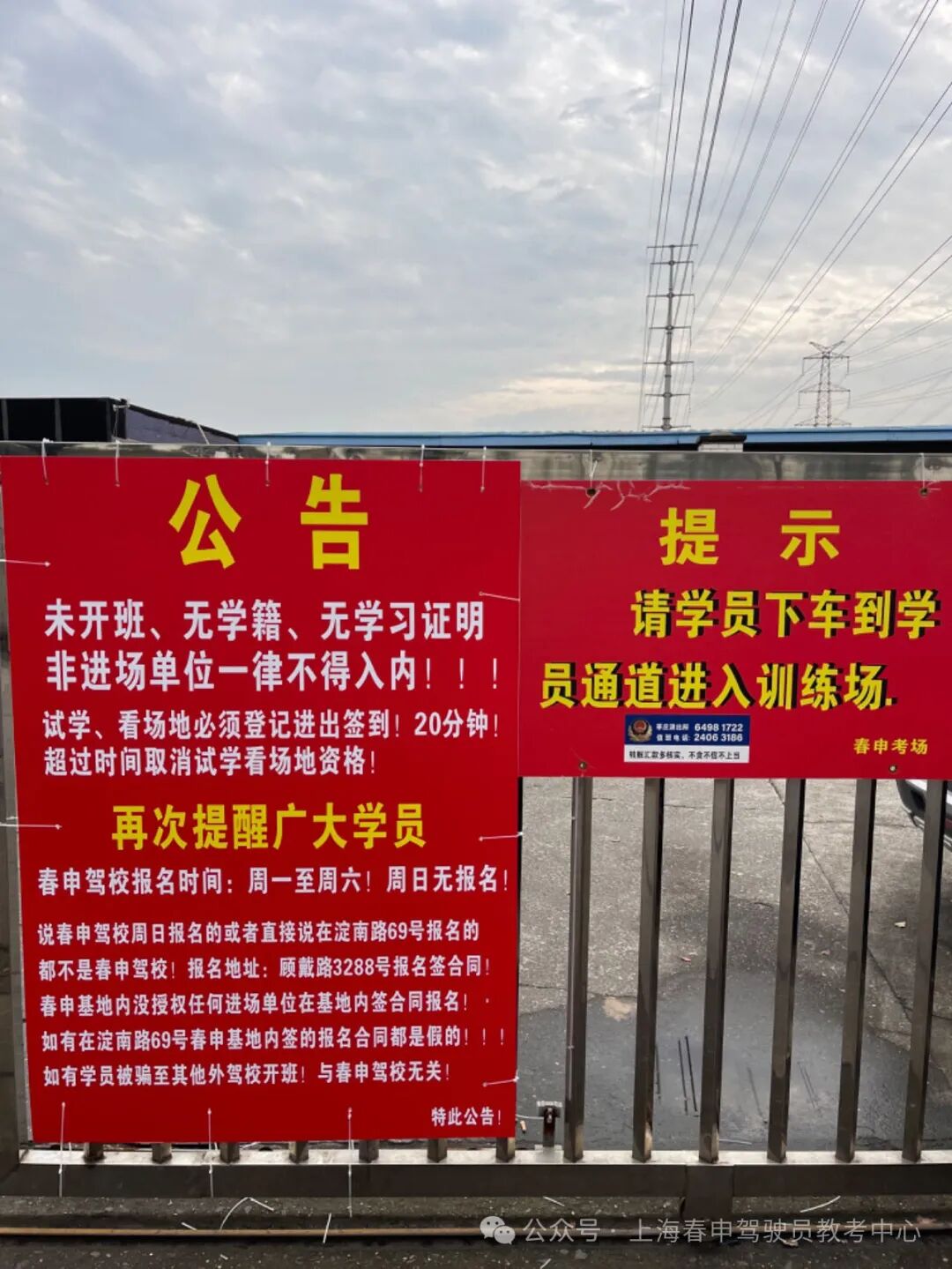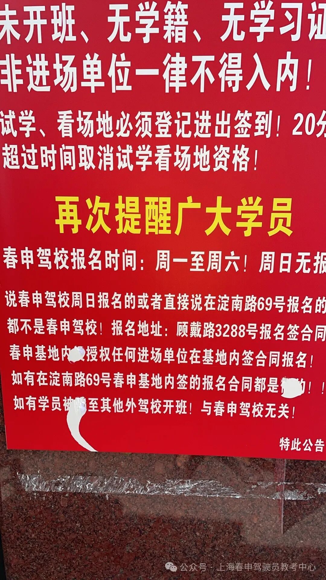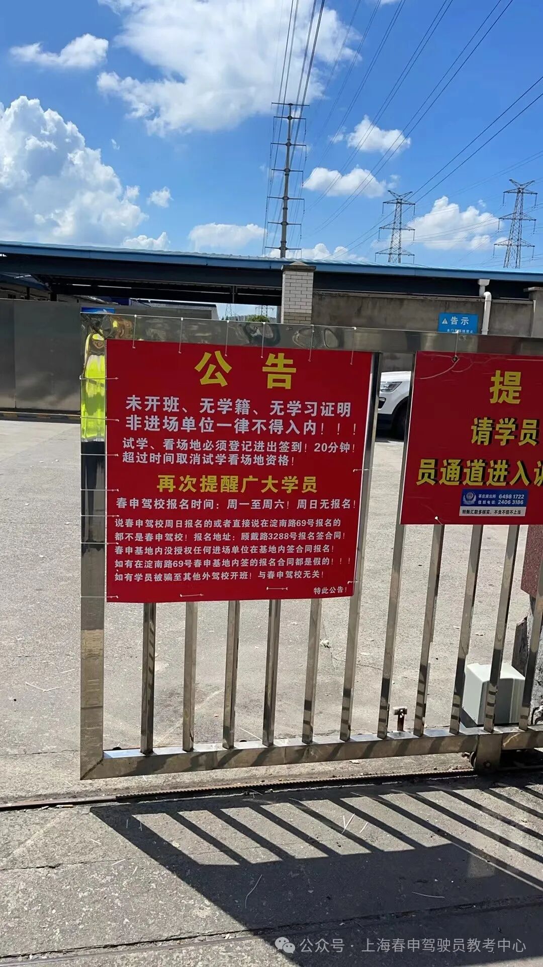 再次提醒广大学员!上海所有大型基地都很乱!我们基地也贴出公告防止学员被骗!中秋放假前期一些不法分子把公告上面字剥去!栏杆上大公告牌不不知去向!(现已换好!大牌没了备用小牌换上!让你们再撕!)由此可见有多乱!请广大学员勿贪图便宜!学车一分价格一分货!上海春申驾驶员教考中心考试场(春申驾校)